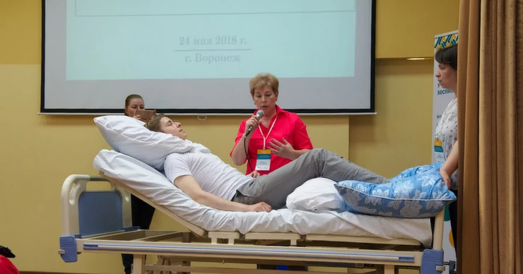 На фото: Третий образовательный паллиативный медицинский форум в ЦФО, Воронеж. Мастер-класс по перемещению лежачих пациентов